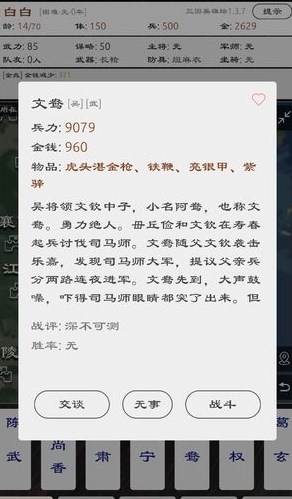 三国英雄坛破解版内置修改器版是一款以三国时期故事作为原型创作的文字游戏,在三国英雄坛破解版内置修改器版中玩家们将操控手下拥有的三国角色,开启全新的三国统一挑战,在这里有丰富的主线故事可以开启,多个不同的结局带来的内容都是不同的,最终的走向由玩家来决定,有兴趣开启属于自己的三国故事的小伙伴们快来下载吧。