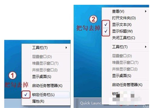步骤三:然后再次鼠标右键任务栏,将锁定任务栏前面的小勾去掉,再将显示文本和显示标题的勾去掉。如图所示;