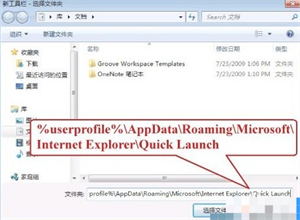 步骤二:在弹出选择文件夹界面中输入%userprofile%\AppData\Roaming\Microsoft\Internet Explorer\Quick Launch并回车,进入下一步。如图所示;
