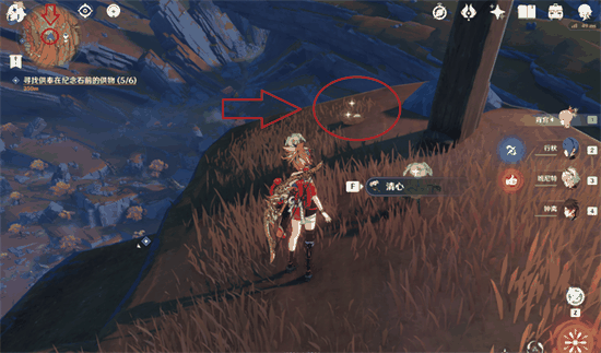 第四件供物,远眺之花。这件供物也是位于山峰的最高处,我们先传送到巨渊之口左侧的七天神像,然后向左下方的丹砂崖前进就行了,一路上通过可以攀爬的位置尽量往高处爬。到达丹砂崖的最高处之后,我们会发现一个自称是古华派传人却穿着盗宝团服饰的人,在他的面前有几株清心,调查之后就能获得远眺之花,同时还能在这个人那里接到另一个支线任务。