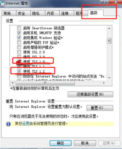 在弹出的页面点击高级选项后,取消使用TLS1.0的勾选,然后勾选上TLS1.2点击确定。或者直接点击还原高级设置。