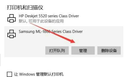 4.勾选之后我们在连接的打印机设备中,找到想要设置成默认打印机的那一个设备,然后点击它,在出现的按钮中点击管理按钮。