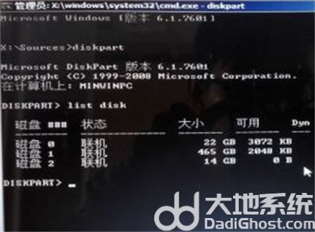 1、按Shift+F10,就会启动具有管理员权限的CMD,输入diskpart启动程序,然后输入list disk来检查自己的硬盘信息(也就是电脑有几个磁盘),有多个磁盘的话选择我们需要安装系统的磁盘编号。(小编选择disk 0为安装系统盘,此时我们输入select disk 0选中磁盘0)
