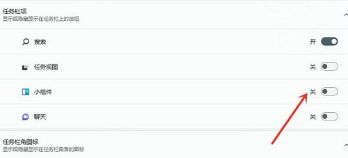 4、在任务栏项设置的下面,关闭【小组件】右侧的滑块,即可关闭小组件
