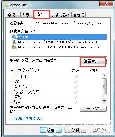 2.在文件夹的属性当中切到【安全】,点击【编辑】;
