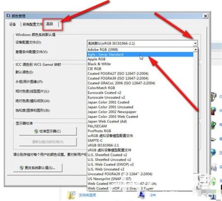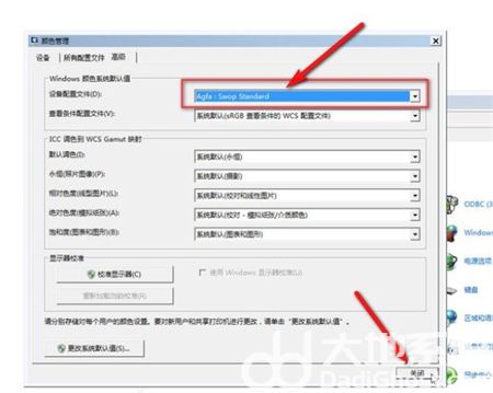 2.在打开的颜色管理对话框,单击打开“高级”选项卡,将Windows颜色系统设备配置文件更改为“Agfa:Swop Standard”。