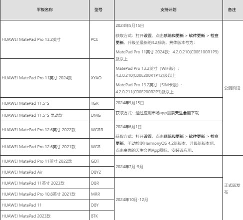 除下方表格中的平板外,更多机型支持计划,请关注后续官方信息。