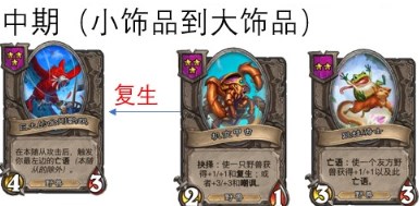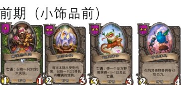 2、巨大的金刚鹦鹉在攻击后会触发最左侧的亡语,因此我们在最左侧放跳蛙、在右侧按照召唤野兽的数量放狡猾的迅猛龙、顽强的坐骑。