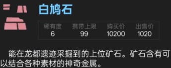 白鸠石石主要出现在龙都遗迹的矿脉中,属于上位矿脉,在采集矿点时有概率获得。