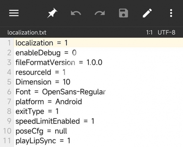 3、打开文件后,将第一行localization的值改为1,保存后即可生效。
