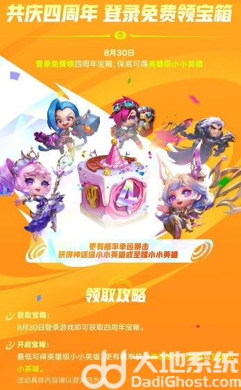 2、登录游戏可免费领取四周年宝箱,保底获得英雄级小小英雄,并有概率开出神话级或至臻小小英雄。