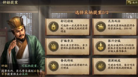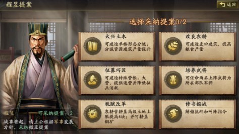 每位文臣有6个提案,主公可以从每个文臣的6个提案里面选2个提案使用,提案采纳后48小时可以重置,消耗50金铢。18项提案包括军事、内政、扩张等方向,主公可以选择最喜欢的提案来享受加成。