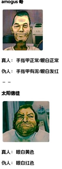 3.随机性的伪人,某特征会和某真人特征一样,例轮椅男伪人时的牙,和amogus真人时的牙一样。