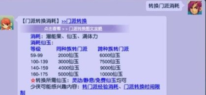 2、玩家等级100级以上,139级以下,同种族转门派需要3000仙玉,跨种族转门派需要7500个仙玉;