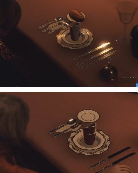 (3)第九章,餐厅里,此处解密为阿什莉和里昂必须坐在正确的位置上,位置显示在餐厅尽头国王和皇后的画像上。让阿什莉坐在右侧第二张椅子上,里昂需要坐在左侧最后一张椅子上。然后依次按下传菜铃,就可以放下蛇雕像两边的铁栏。