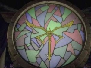 在教堂大门右侧里面的柜子里里找到蓝色按钮,放在教堂中间空缺的位置上,绿色和蓝色碎片都能正好卡在徽记下面两个凹槽里,最后转红色。